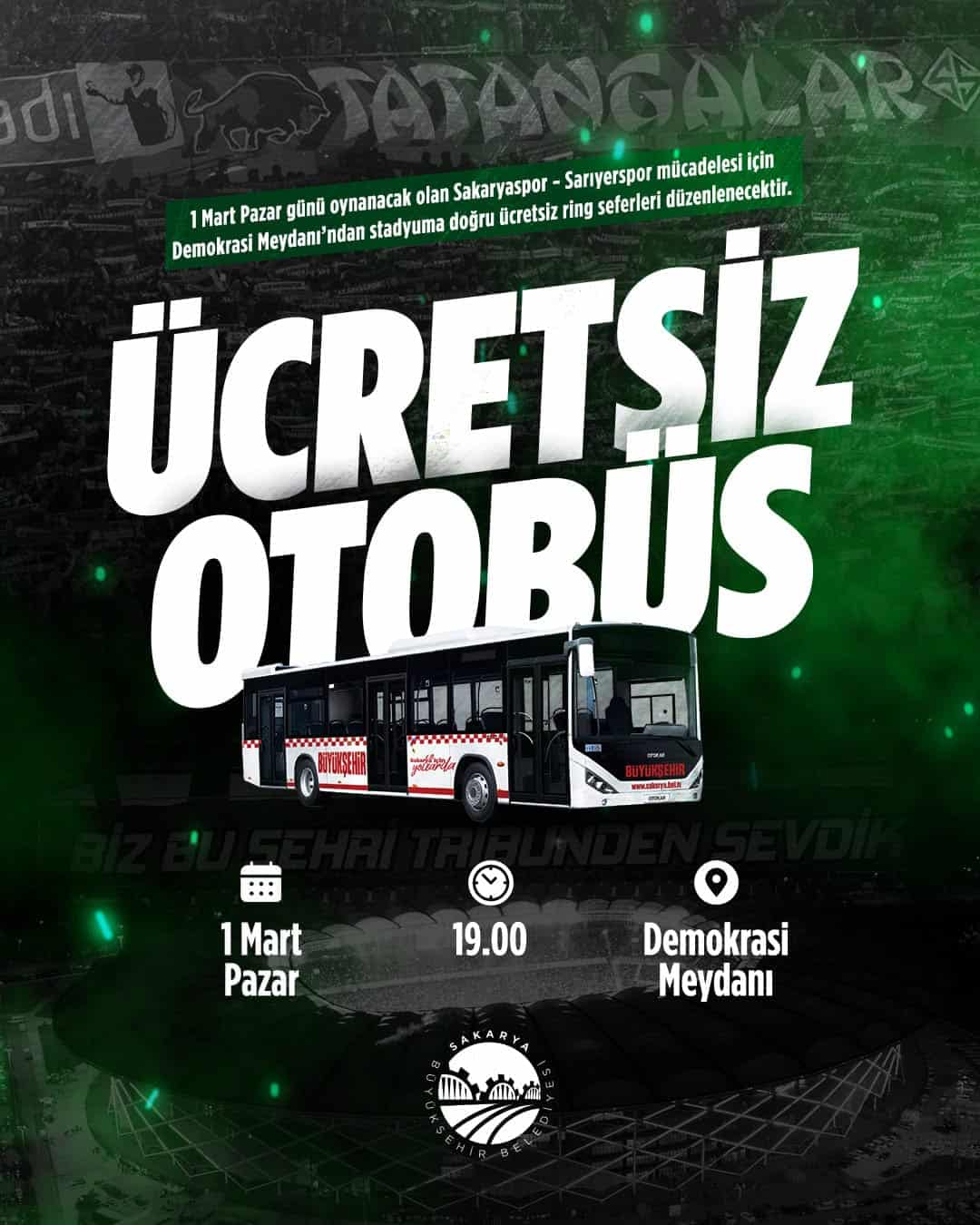 TFF 1. Lig’de hafta sonu oynanacak Sakaryaspor–Sarıyerspor müsabakası öncesinde, taraftarların Demokrasi Meydanı‘ndan stadyuma ücretsiz olarak taşınması planlandı.