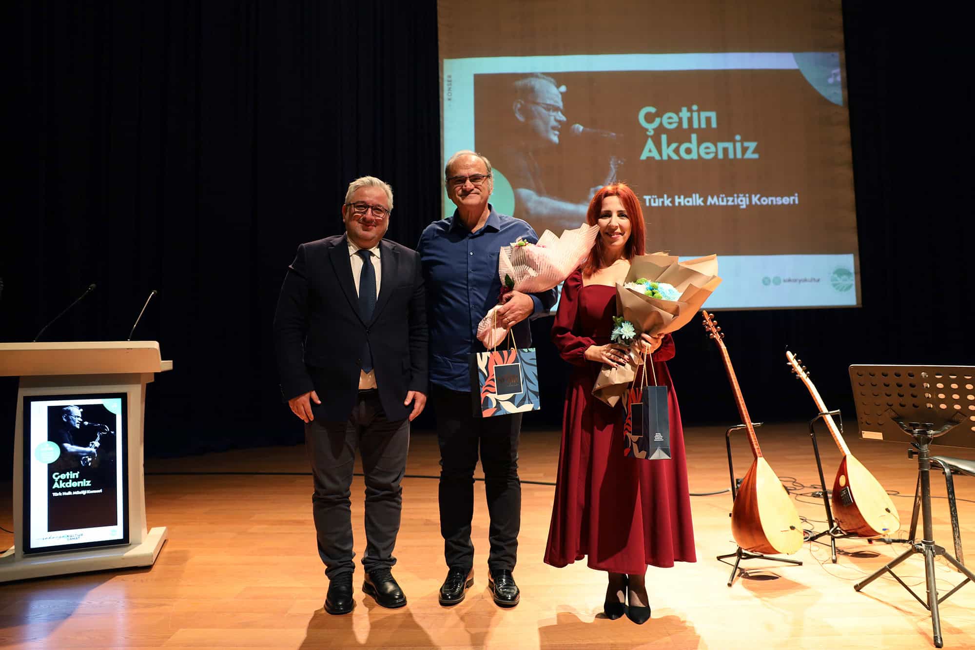 SAÜ Kültür ve Kongre Merkezi’nde gerçekleşen konserde sahnedeki güçlü performansıyla dinleyicilerini derin bir müzik yolculuğuna çıkaran Akdeniz, repertuvarındaki halk müziği eserlerini ustalıkla yorumladı.