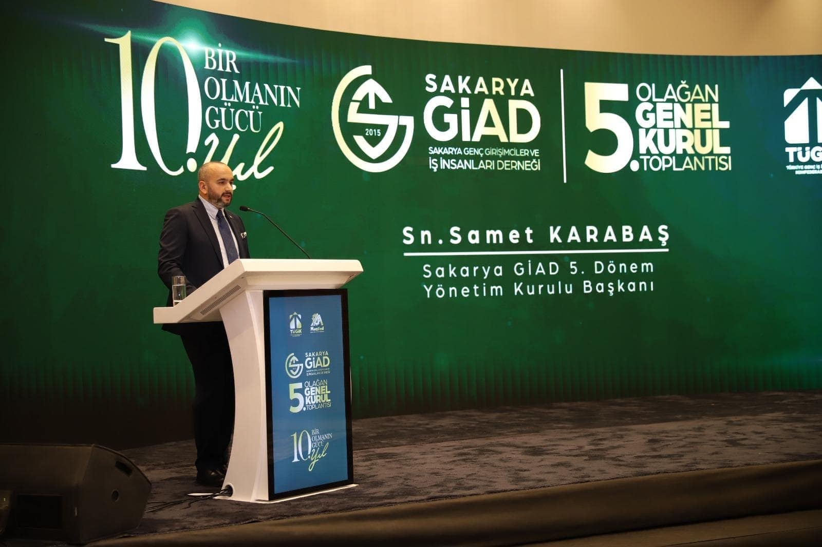 Sakarya GİAD’ın 5. Olağan Genel Kurulu sonucu Yönetim Kurulu Başkanlığını devralan Samet Karabaş yaptığı konuşmada; “Bugün Sakarya GİAD ailesinde bir bayrak değişimi yaşanıyor. Ancak güçlü ailemizin dünden farklı bir rotası olmayacak. “Bir Olmanın Gücü” anlayışıyla, birlikteliğimizi daha da pekiştirerek, devraldığım bu bayrağı daha yukarı taşımak için gayret göstereceğim.
